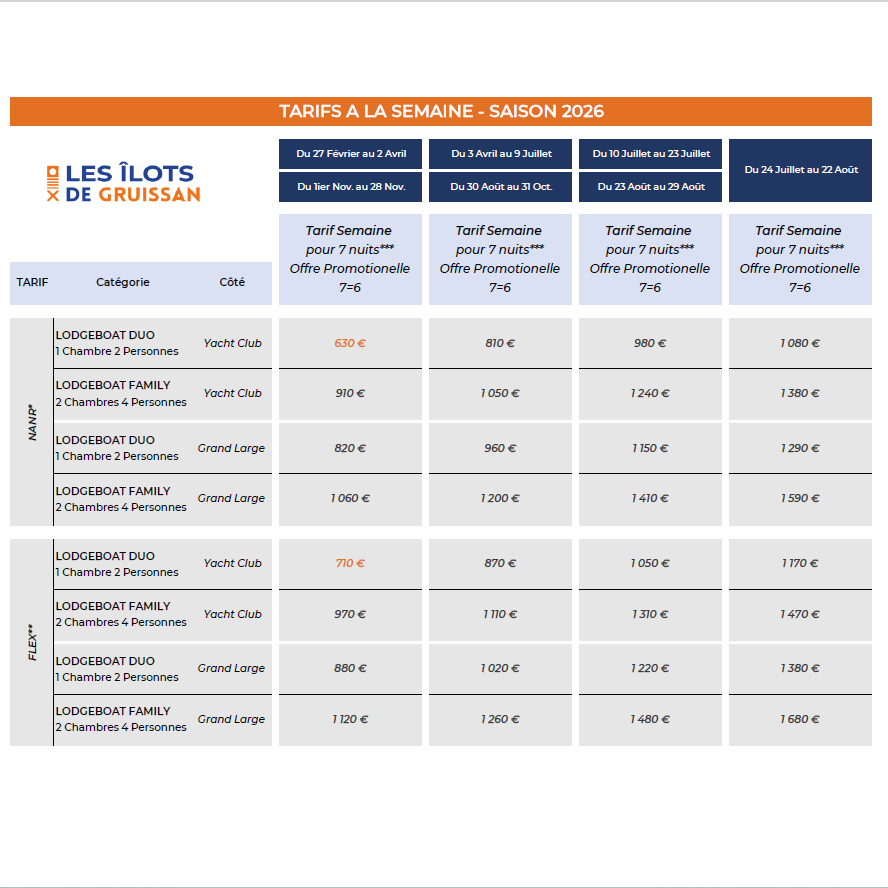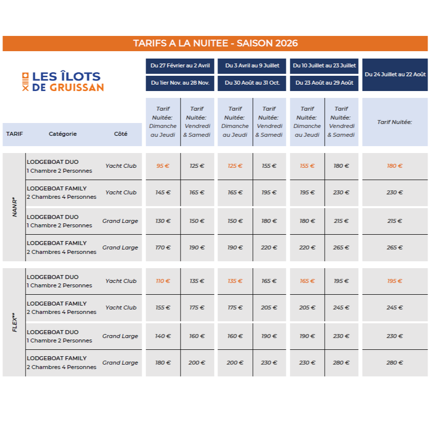 Bienvenue aux Ilots de Gruissan! Nous vous accueillons à bord de nos Ilots du 27 février au 29 novembre 2026. Que ce soit pour une ou plusieurs nuits, seul, en couple, entre amis ou en famille, il y aura toujours un séjour qui sera fait pour vous.